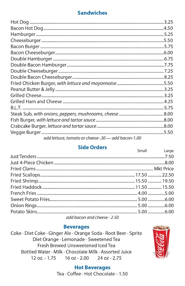The menu also caters to non-seafood lovers, featuring Double and Single Hamburgers, the popular Bacon Burger, and even a Chicken Breast Burger. Don’t miss their renowned Maine Crab Cake Burger and classic comfort options like Brownie Sundae and Banana Split for dessert.