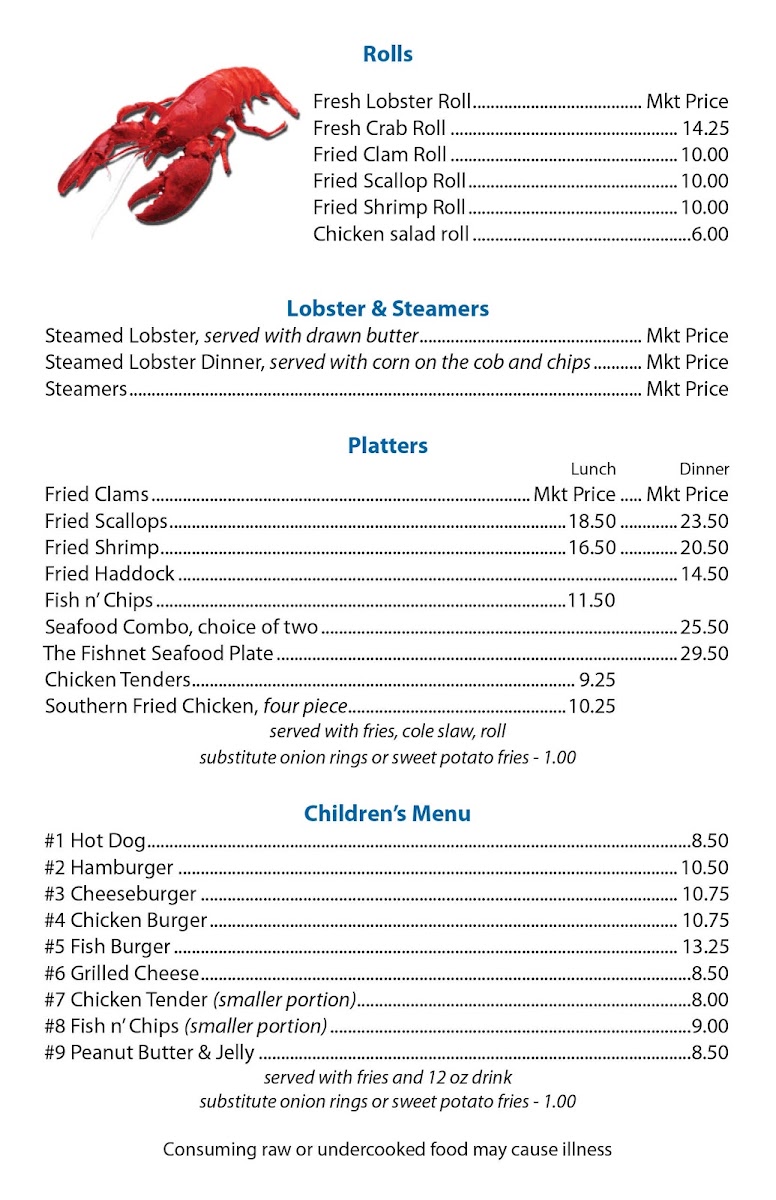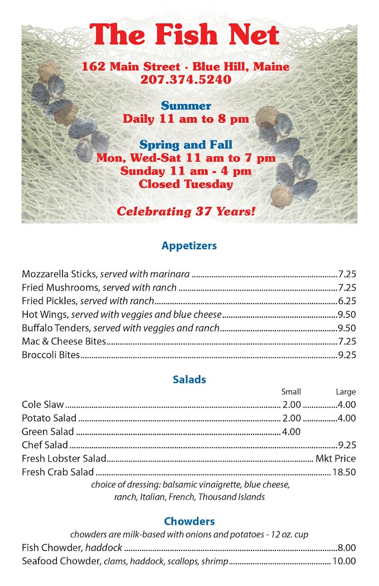Introducing the menu at Fish Net, located in the charming town of Blue Hill, ME, is a delightful journey into the heart of coastal cuisine. This eatery specializes in fresh seafood, offering highlights such as Fish Chowder, Haddock Seafood Chowder, and a range of Steamed Lobster dishes served with drawn butter. The seafood platter is a customer favorite, praised for its abundant flavors.